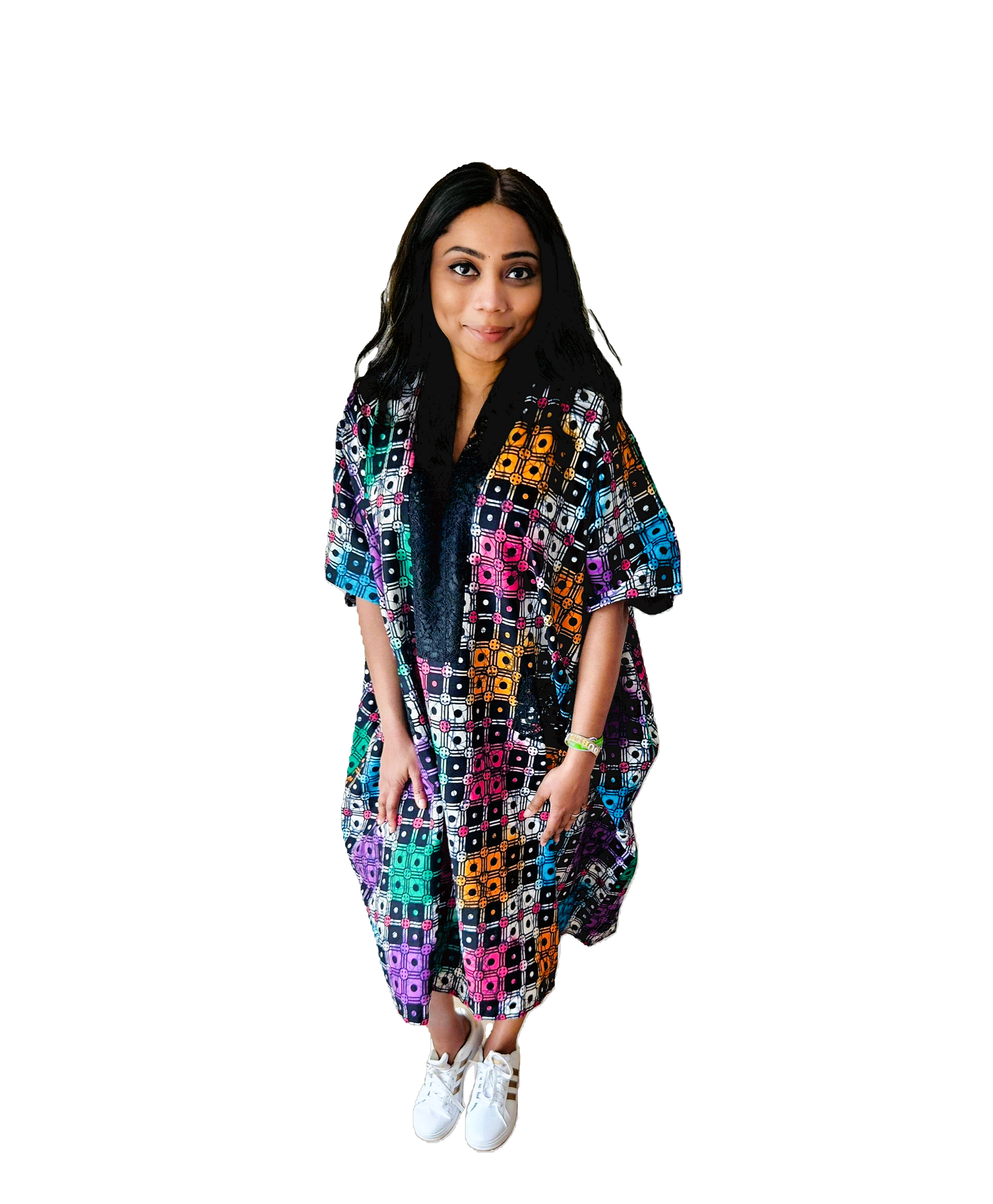 Make a powerful style statement in this striking kaftan dress, where bold geometric prints meet fluid, elegant design.